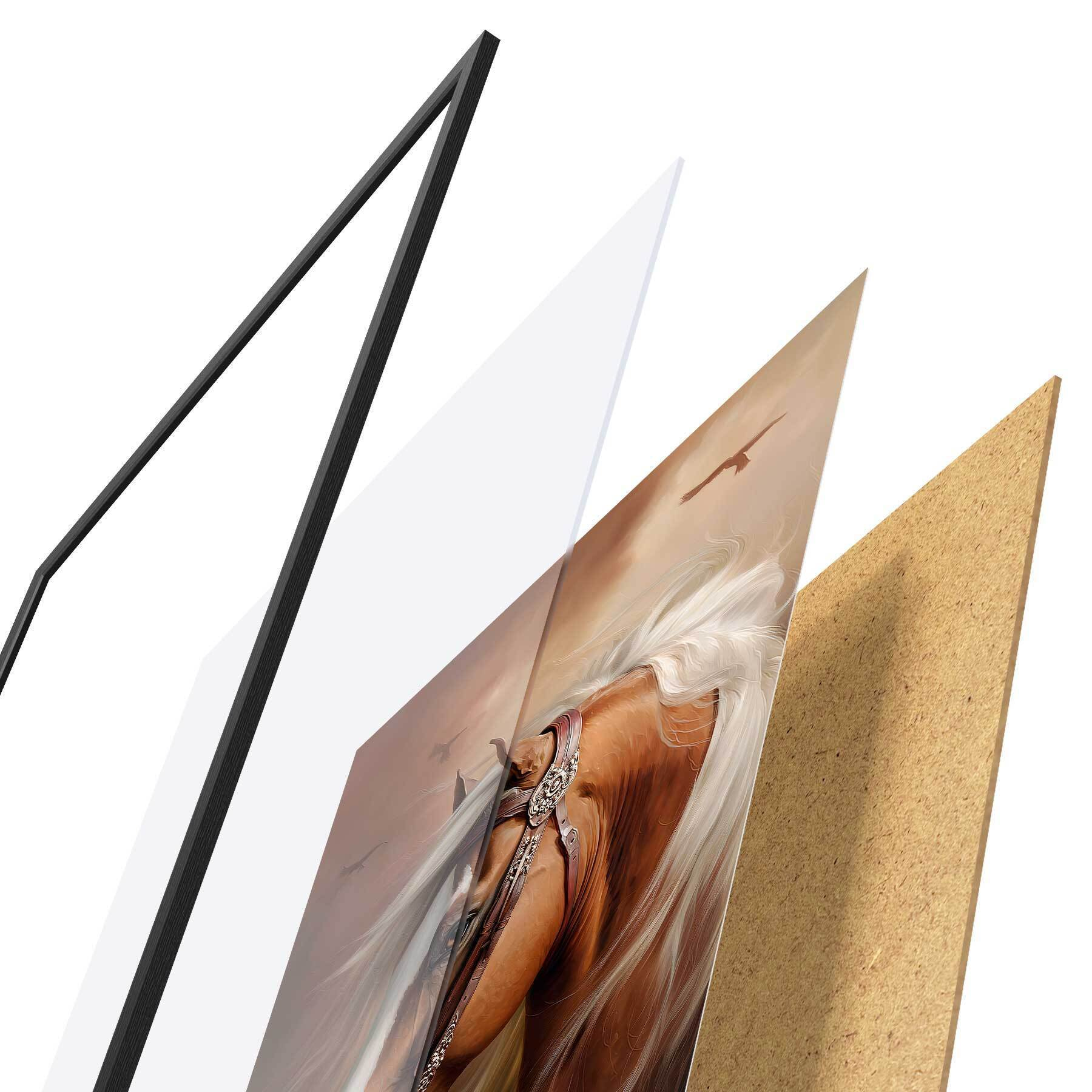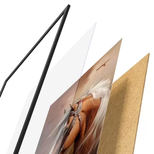 Plakat składa się z ramy, pleksi, wydrukowanego obrazu i podkładu z płyty wiórowej. Plakat można natychmiast zawiesić na ścianie dzięki uchwytom z tyłu.