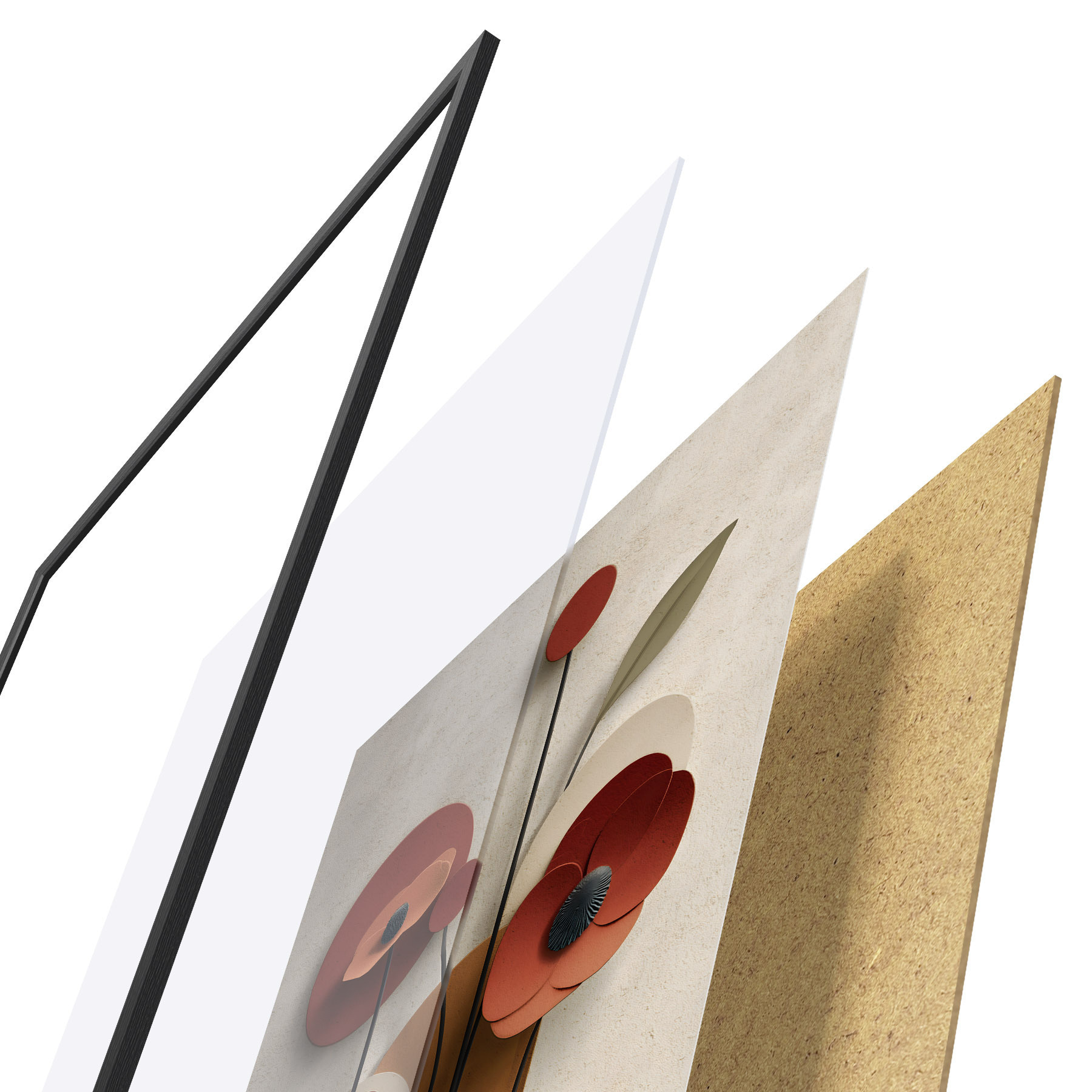 Plakat składa się z ramy, pleksi, wydrukowanego obrazu i podkładu z płyty wiórowej. Plakat można natychmiast zawiesić na ścianie dzięki uchwytom z tyłu.