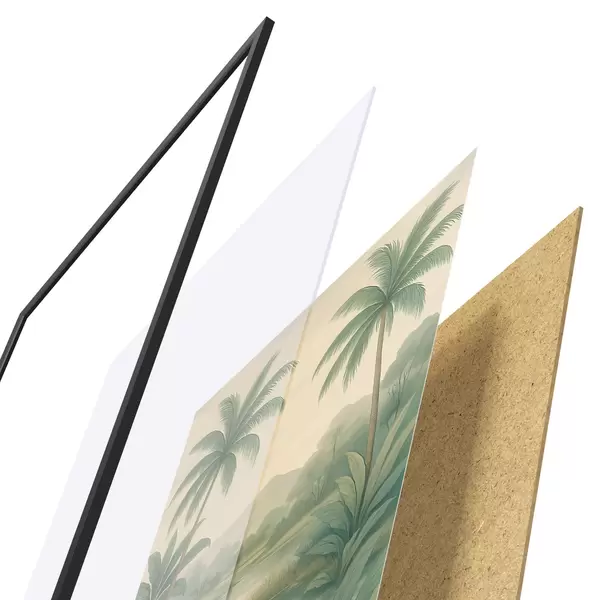 Plakat składa się z ramy, pleksi, wydrukowanego obrazu i podkładu z płyty wiórowej. Plakat można natychmiast zawiesić na ścianie dzięki uchwytom z tyłu.