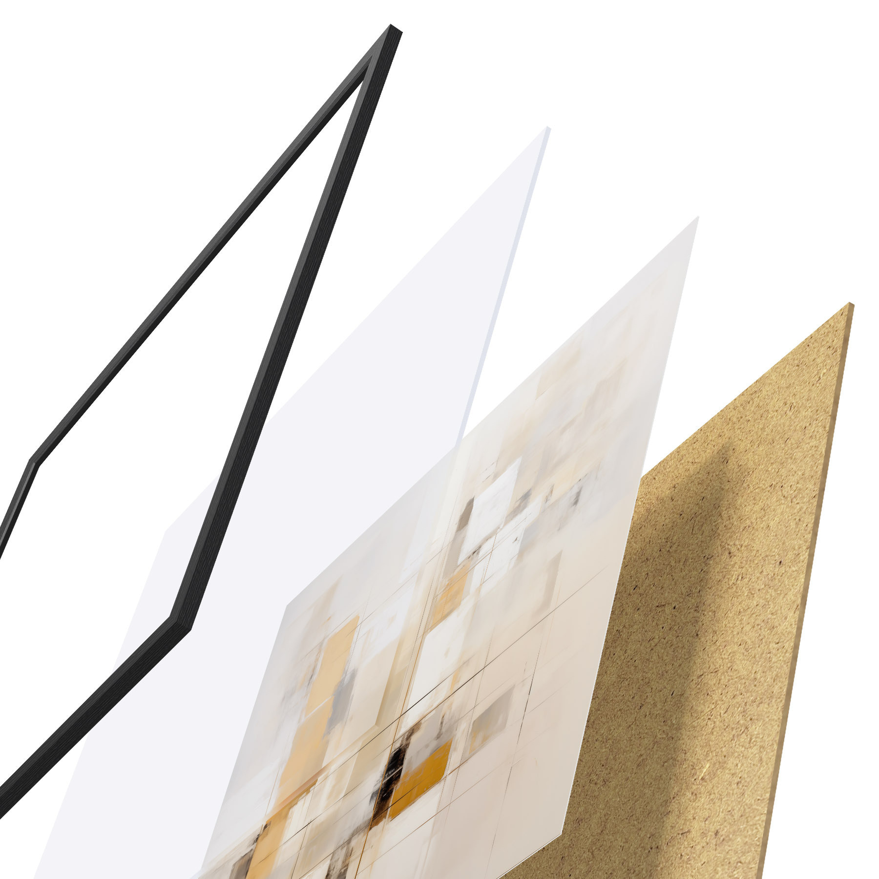 Plakat składa się z ramy, pleksi, wydrukowanego obrazu i podkładu z płyty wiórowej. Plakat można natychmiast zawiesić na ścianie dzięki uchwytom z tyłu.