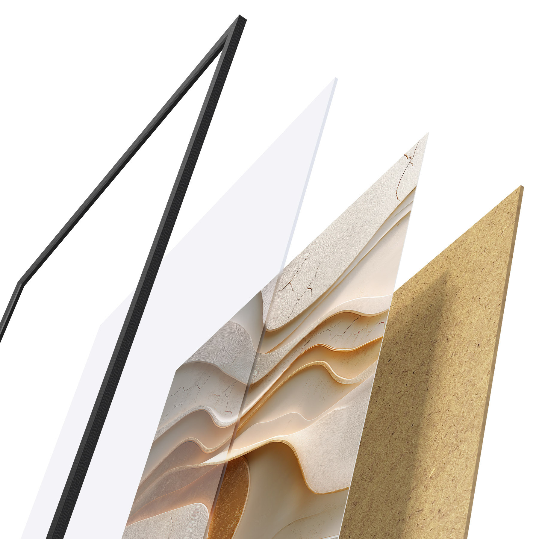Plakat składa się z ramy, pleksi, wydrukowanego obrazu i podkładu z płyty wiórowej. Plakat można natychmiast zawiesić na ścianie dzięki uchwytom z tyłu.