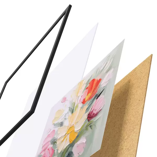 Plakat składa się z ramy, pleksi, wydrukowanego obrazu i podkładu z płyty wiórowej. Plakat można natychmiast zawiesić na ścianie dzięki uchwytom z tyłu.