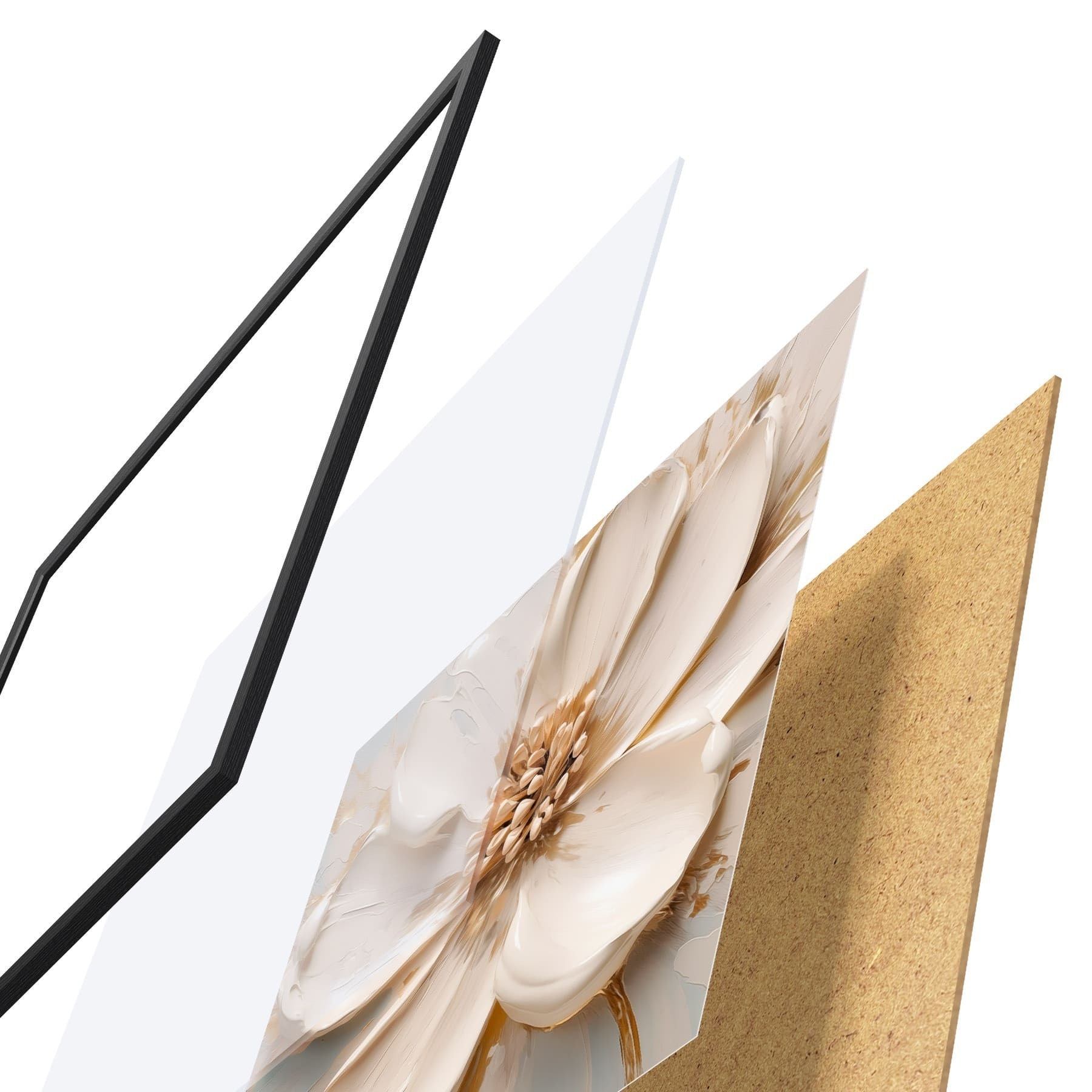 Plakat składa się z ramy, pleksi, wydrukowanego obrazu i podkładu z płyty wiórowej. Plakat można natychmiast zawiesić na ścianie dzięki uchwytom z tyłu.