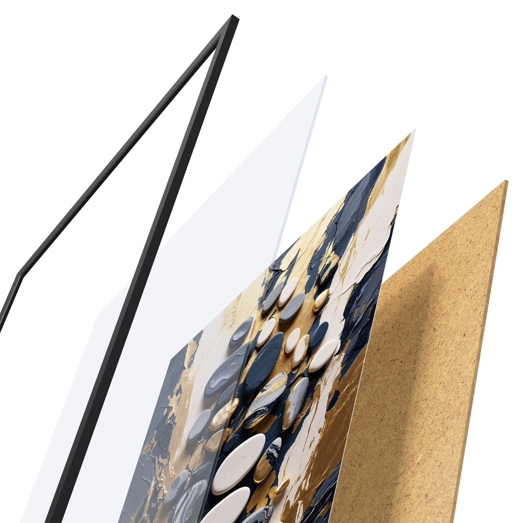 Plakat składa się z ramy, pleksi, wydrukowanego obrazu i podkładu z płyty wiórowej. Plakat można natychmiast zawiesić na ścianie dzięki uchwytom z tyłu.