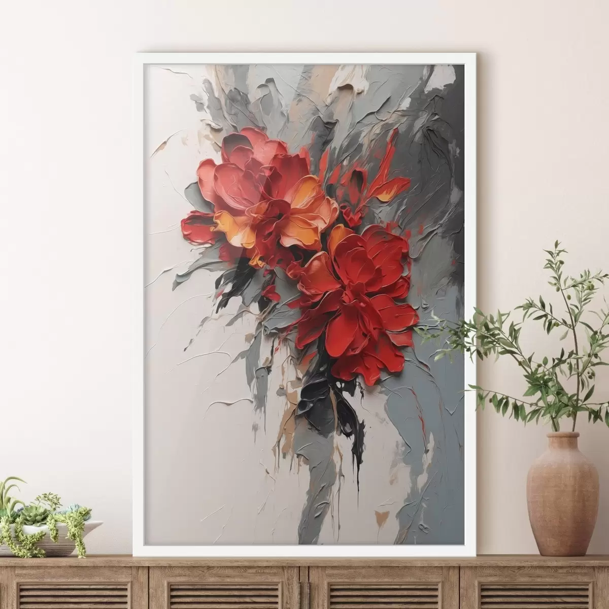 Plakat Czerwone kwiaty z fakturą pociągnięć pędzlem na jasnym tle f48365