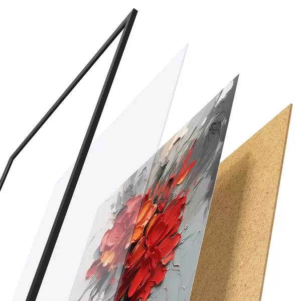 Plakat składa się z ramy, pleksi, wydrukowanego obrazu i podkładu z płyty wiórowej. Plakat można natychmiast zawiesić na ścianie dzięki uchwytom z tyłu.