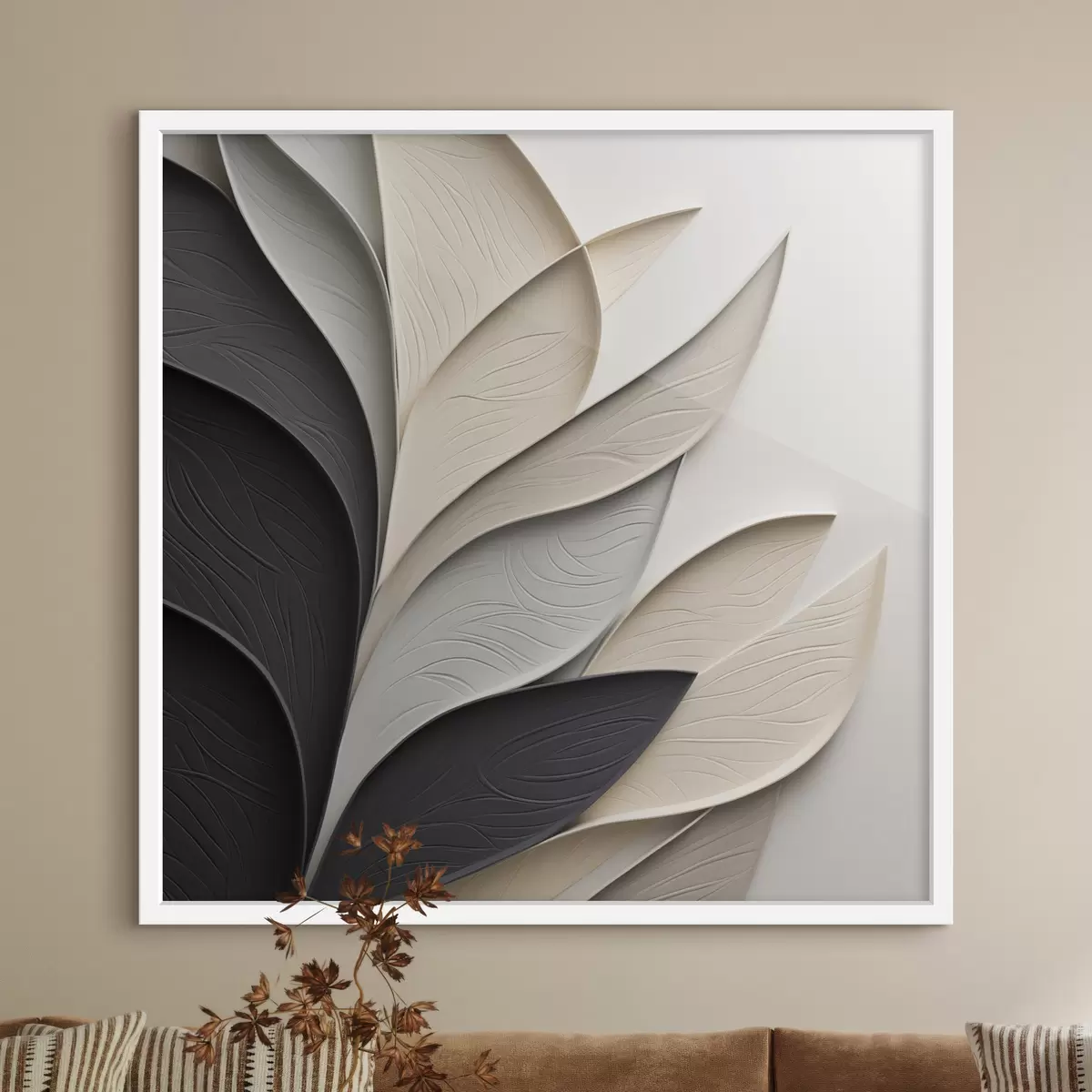 Plakat Kompozycja abstrakcyjna złożona z ułożonych warstwowo liści, zakrzywionych kształtów w kolorach czarnym, białym i beżowym oraz teksturowanych elementów f48382