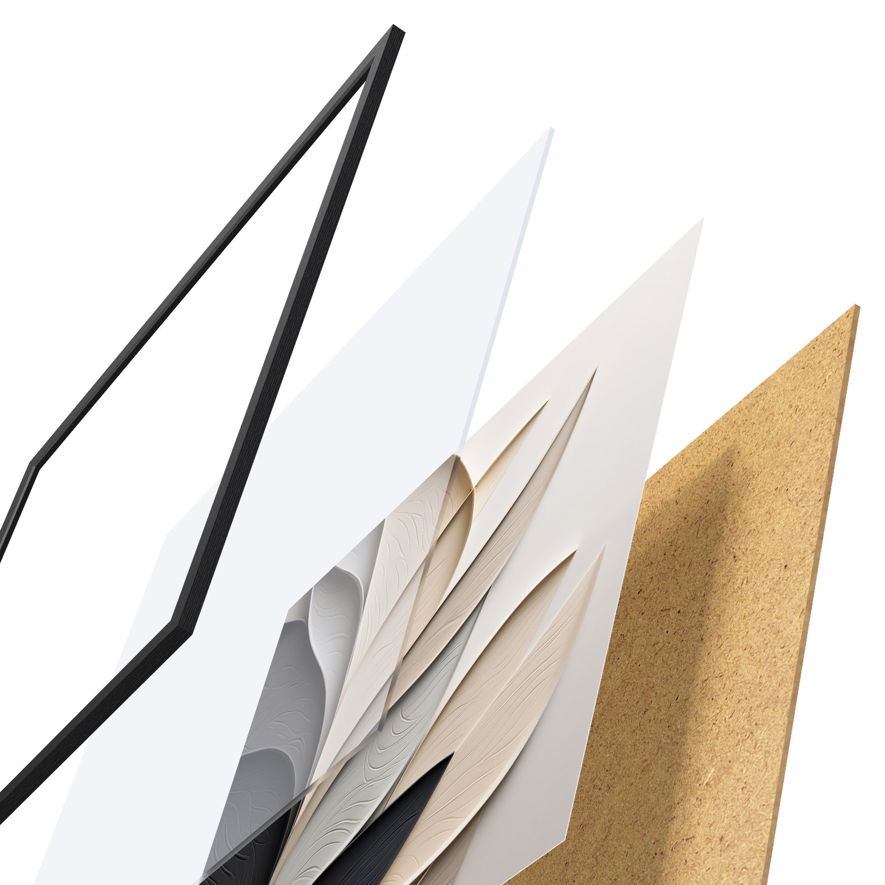 Poster Kompozycja abstrakcyjna złożona z ułożonych warstwowo liści, zakrzywionych kształtów w kolorach czarnym, białym i beżowym oraz teksturowanych elementów Nr f48382