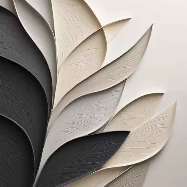 Poster Kompozycja abstrakcyjna złożona z ułożonych warstwowo liści, zakrzywionych kształtów w kolorach czarnym, białym i beżowym oraz teksturowanych elementów Nr f48382