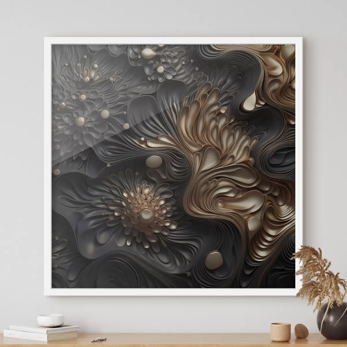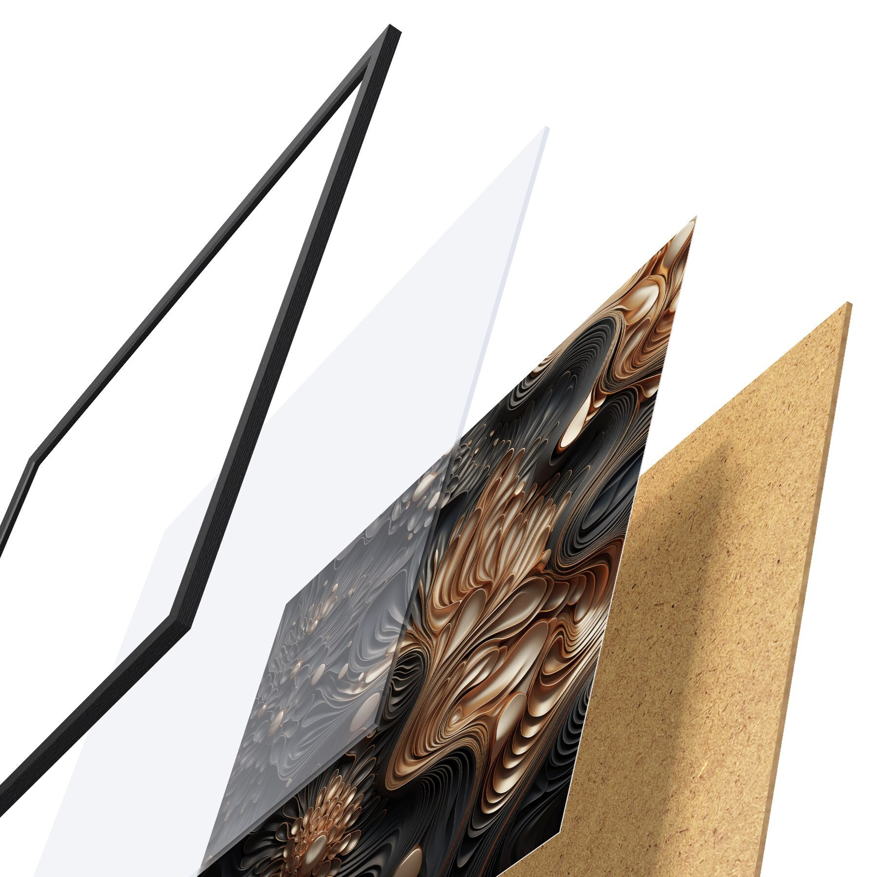 Plakat składa się z ramy, pleksi, wydrukowanego obrazu i podkładu z płyty wiórowej. Plakat można natychmiast zawiesić na ścianie dzięki uchwytom z tyłu.