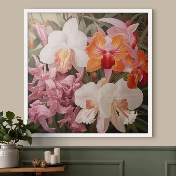 Poster Bukiet tropikalnych kwiatów, orchidee na tle zielonej roślinności Nr f48385