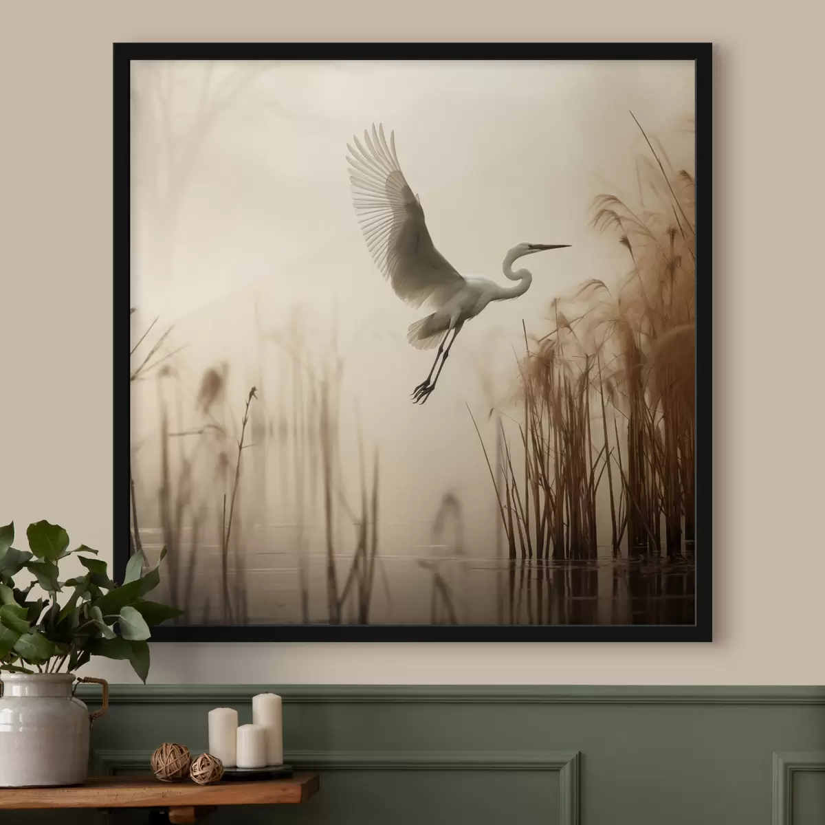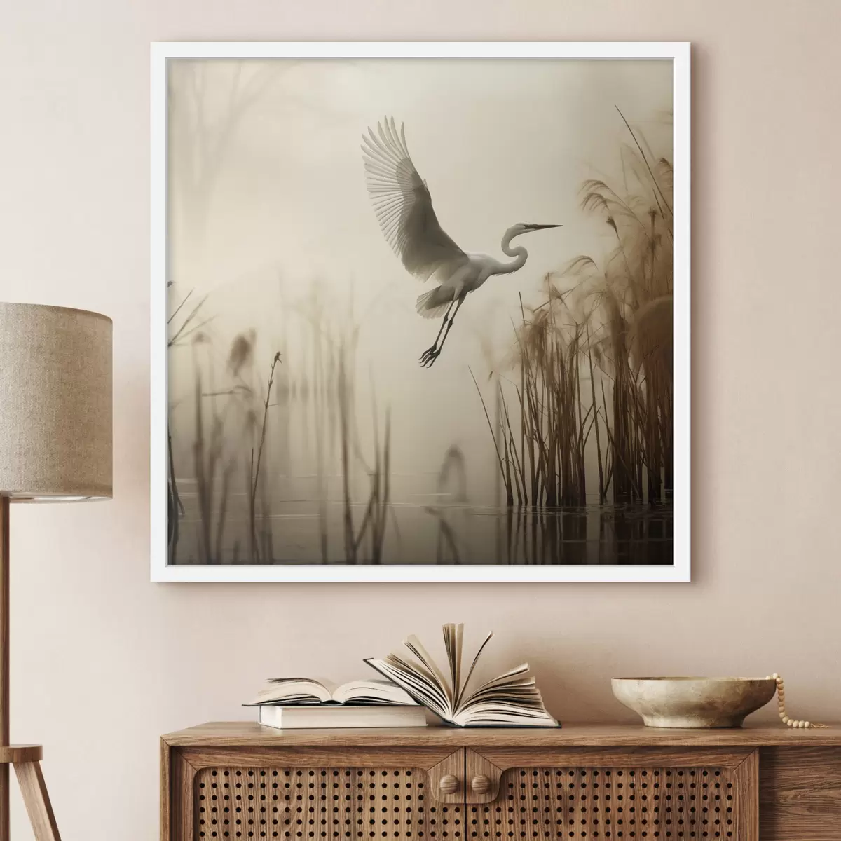 Plakat Biała czapla przelatuje nad jeziorem, otoczona wysokimi trzcinami i drzewami w tle f48389