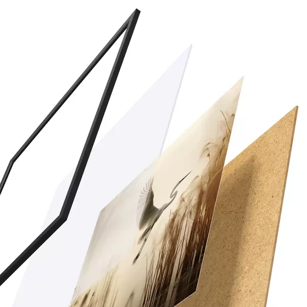Plakat składa się z ramy, pleksi, wydrukowanego obrazu i podkładu z płyty wiórowej. Plakat można natychmiast zawiesić na ścianie dzięki uchwytom z tyłu.