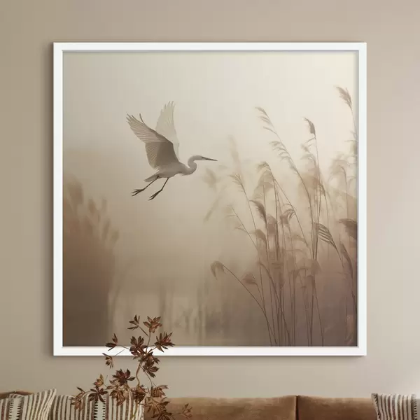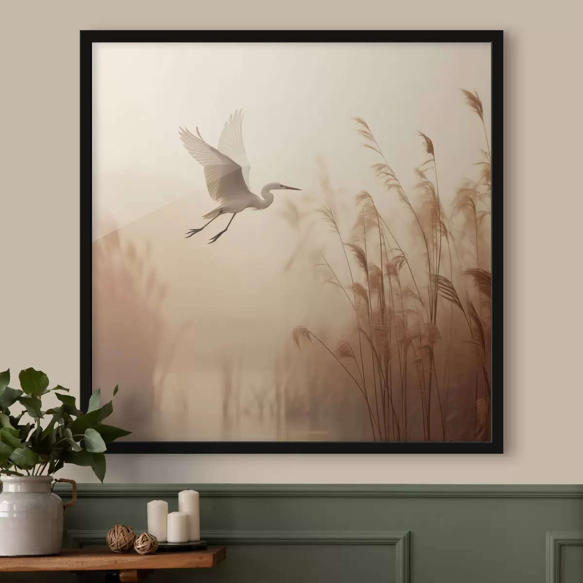 Plakat Biała czapla przelatuje nad jeziorem, otoczona wysokimi trzcinami i drzewami w tle f48390