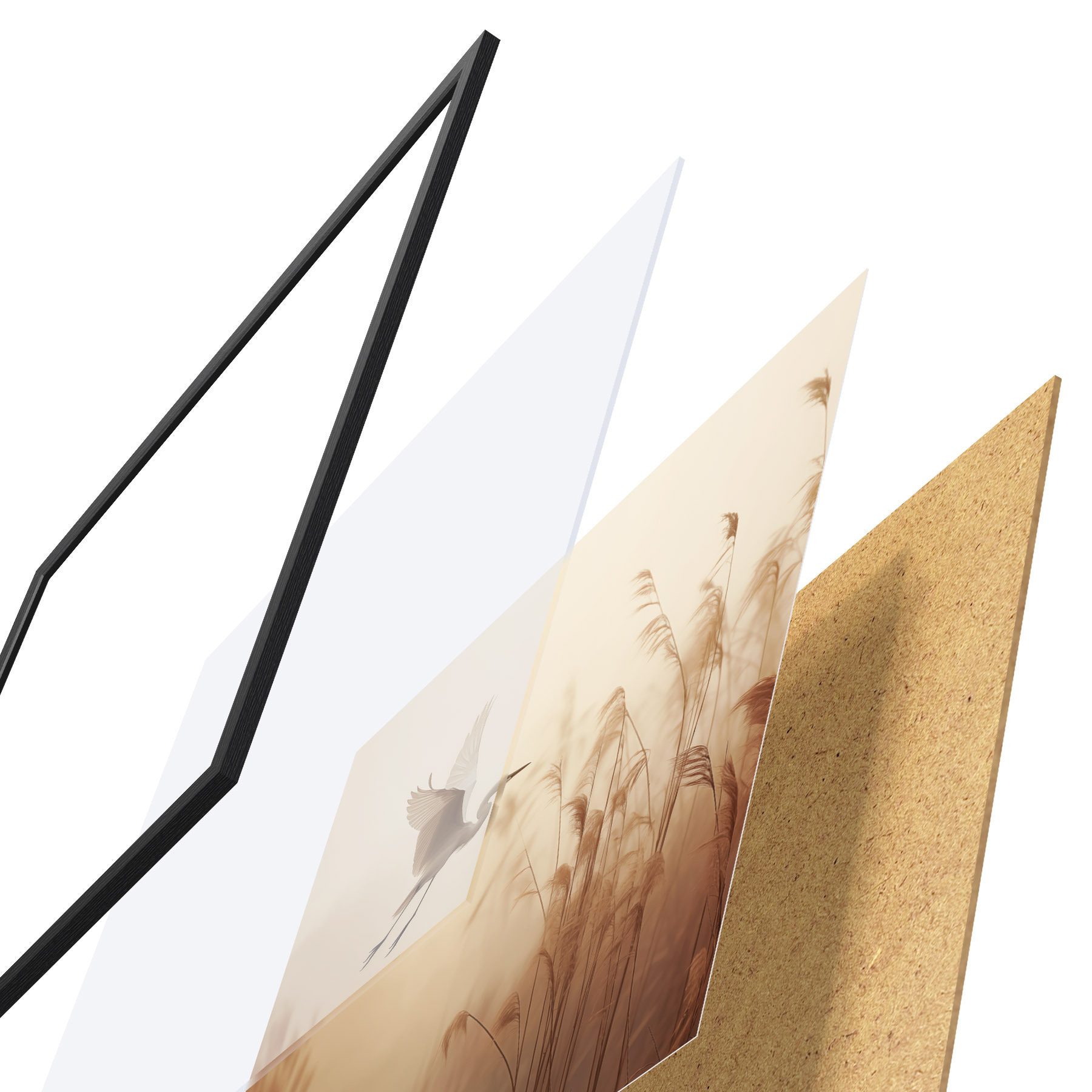 Plakat składa się z ramy, pleksi, wydrukowanego obrazu i podkładu z płyty wiórowej. Plakat można natychmiast zawiesić na ścianie dzięki uchwytom z tyłu.
