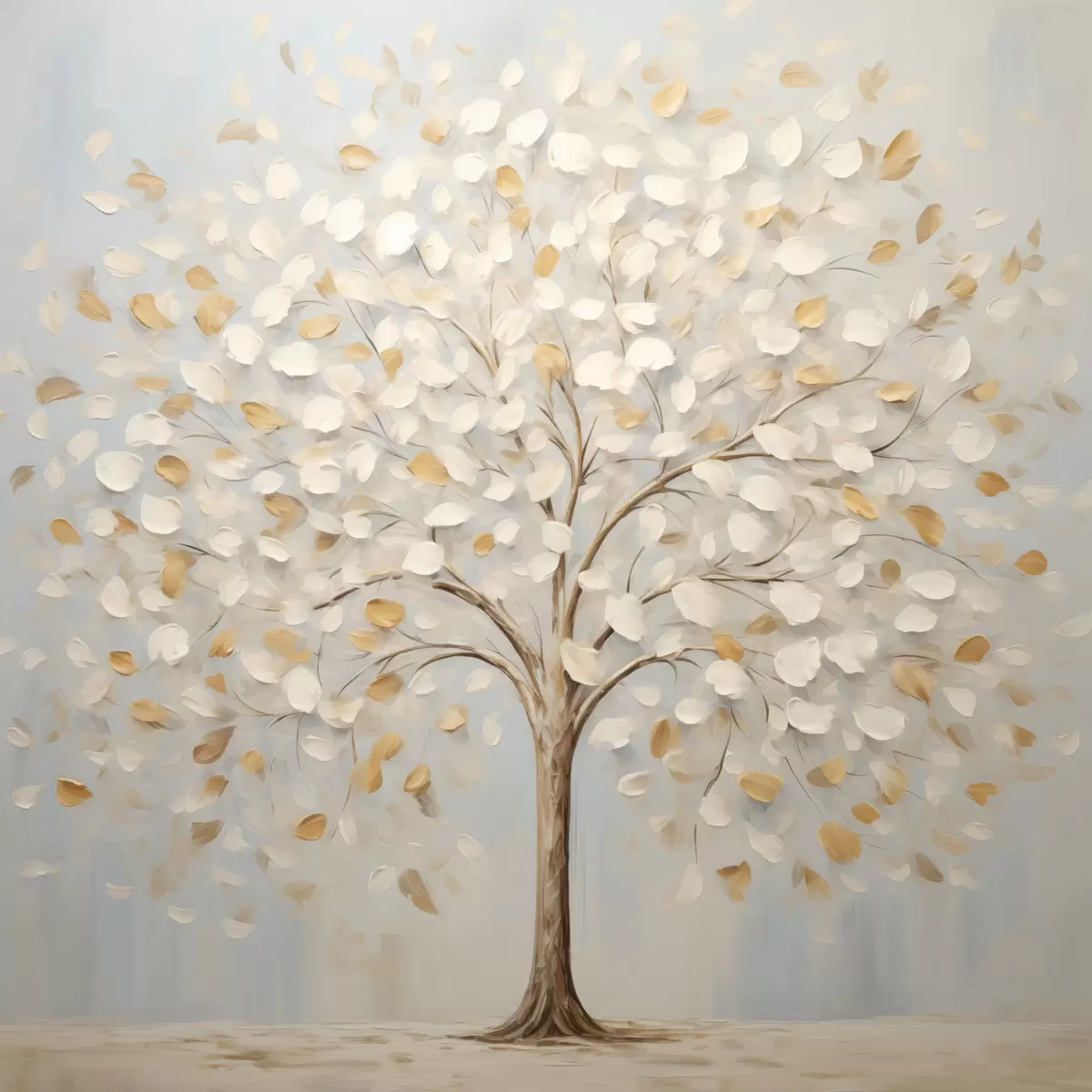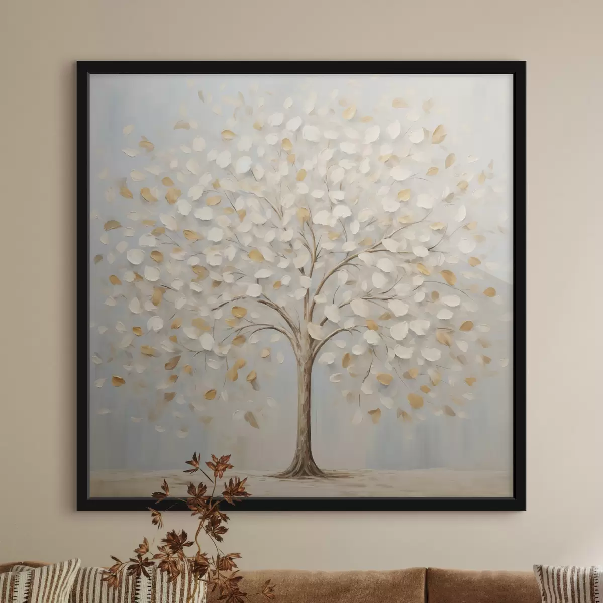 Plakat Obraz przedstawiający drzewo o fakturalnej fakturze, z białymi i żółtymi liśćmi na jasnoniebieskim tle f48391