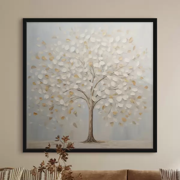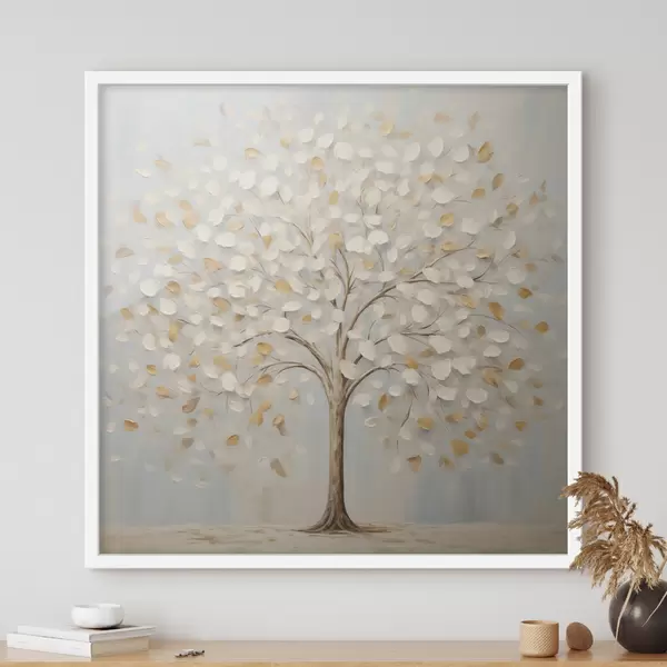 Poster Obraz przedstawiający drzewo o fakturalnej fakturze, z białymi i żółtymi liśćmi na jasnoniebieskim tle Nr f48391