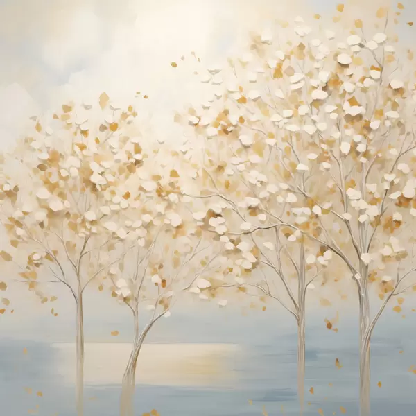 Poster Obraz przedstawiający drzewa o fakturalnym wyglądzie, z białymi i żółtymi liśćmi na jasnoniebieskim tle Nr f48392