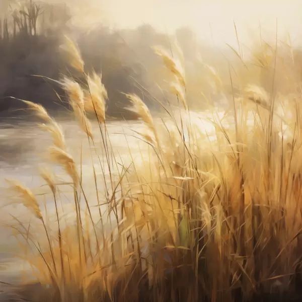 Poster Na pierwszym planie wysoka, wyschnięta trawa z kłoskami, a w tle jezioro i drzewa Nr f48394