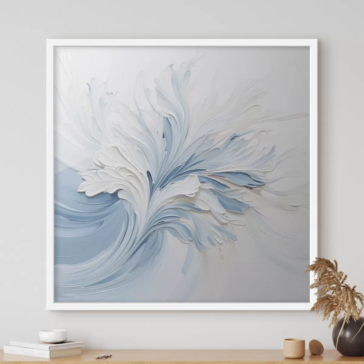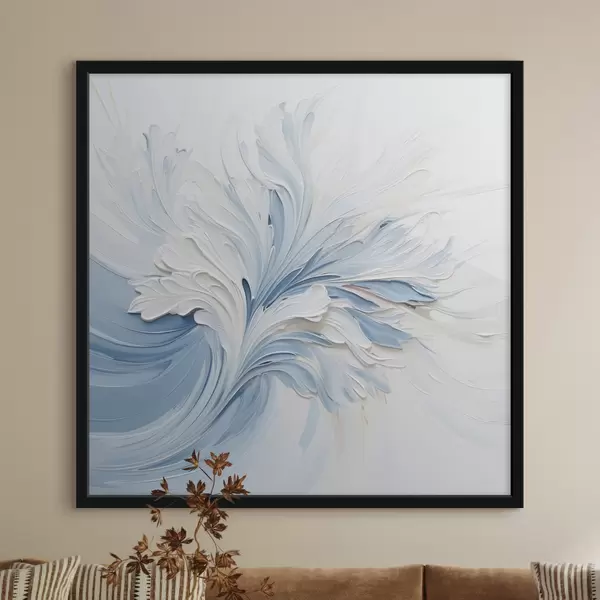 Plakat Biało-jasnoniebieski abstrakcyjny wzór kwiatowy z teksturowanymi płatkami i wijącymi się liniami f48395