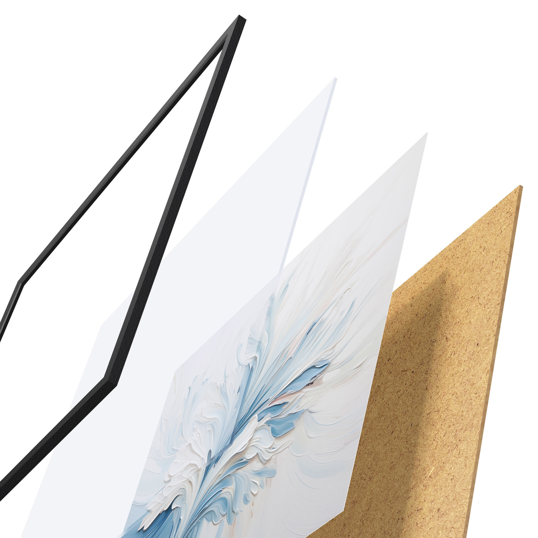 Plakat składa się z ramy, pleksi, wydrukowanego obrazu i podkładu z płyty wiórowej. Plakat można natychmiast zawiesić na ścianie dzięki uchwytom z tyłu.