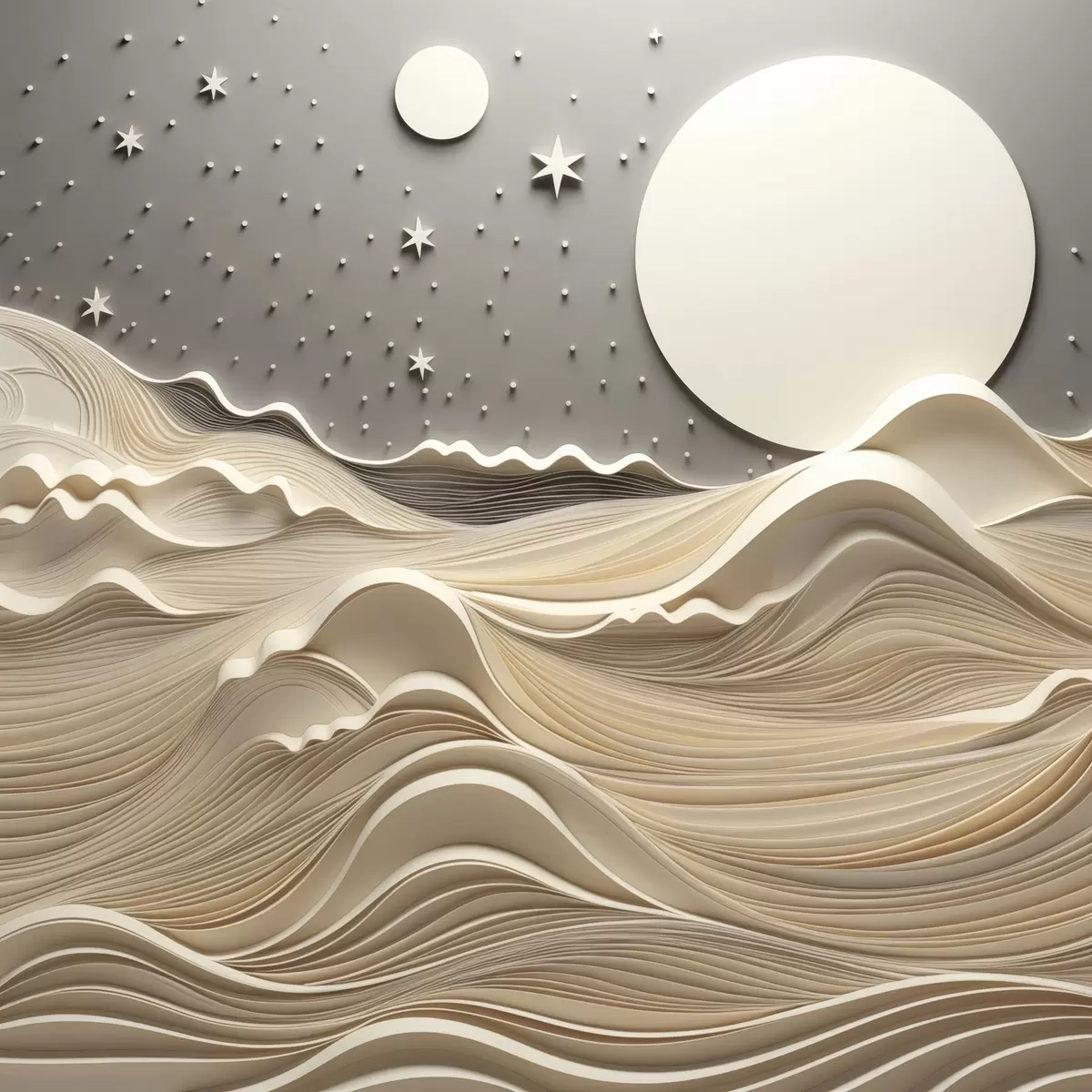 Poster Minimalistyczny, stylizowany pejzaż z falistymi wzgórzami i wielkim księżycem na gwiaździstym niebie; sztuka abstrakcyjna Nr f48401