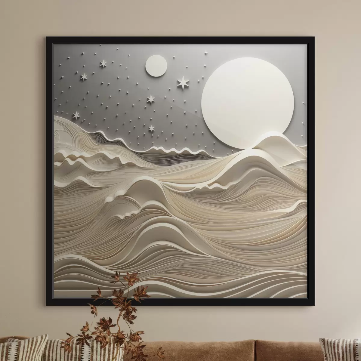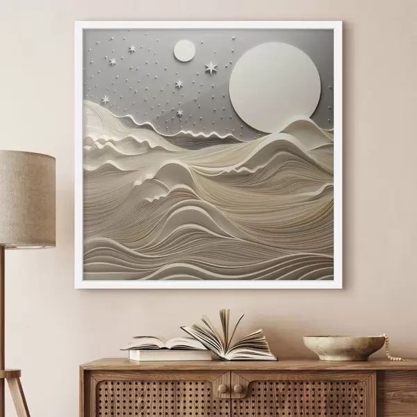 Plakat Minimalistyczny, stylizowany pejzaż z falistymi wzgórzami i wielkim księżycem na gwiaździstym niebie; sztuka abstrakcyjna f48401