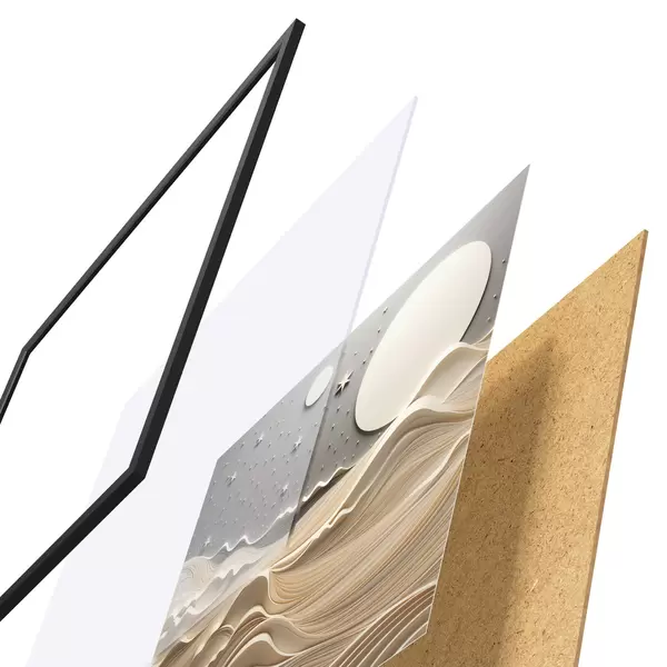 Plakat składa się z ramy, pleksi, wydrukowanego obrazu i podkładu z płyty wiórowej. Plakat można natychmiast zawiesić na ścianie dzięki uchwytom z tyłu.