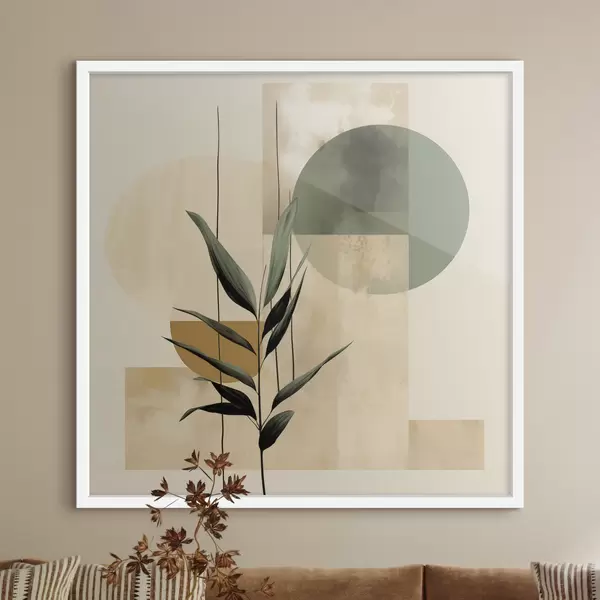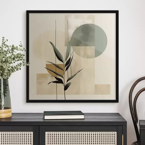 Plakat Ciemnozielona roślina z abstrakcyjnymi geometrycznymi kształtami i akwarelowymi fakturami w odcieniach beżu i zieleni f48409