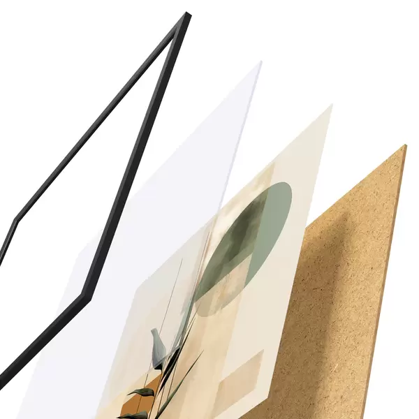 Plakat składa się z ramy, pleksi, wydrukowanego obrazu i podkładu z płyty wiórowej. Plakat można natychmiast zawiesić na ścianie dzięki uchwytom z tyłu.