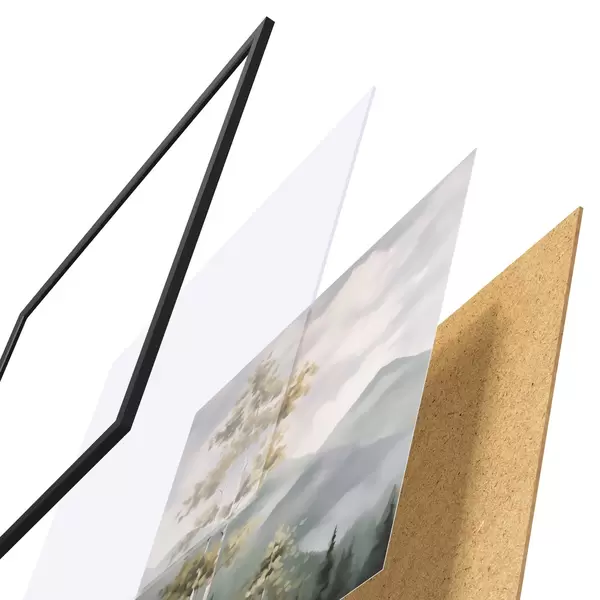 Plakat składa się z ramy, pleksi, wydrukowanego obrazu i podkładu z płyty wiórowej. Plakat można natychmiast zawiesić na ścianie dzięki uchwytom z tyłu.