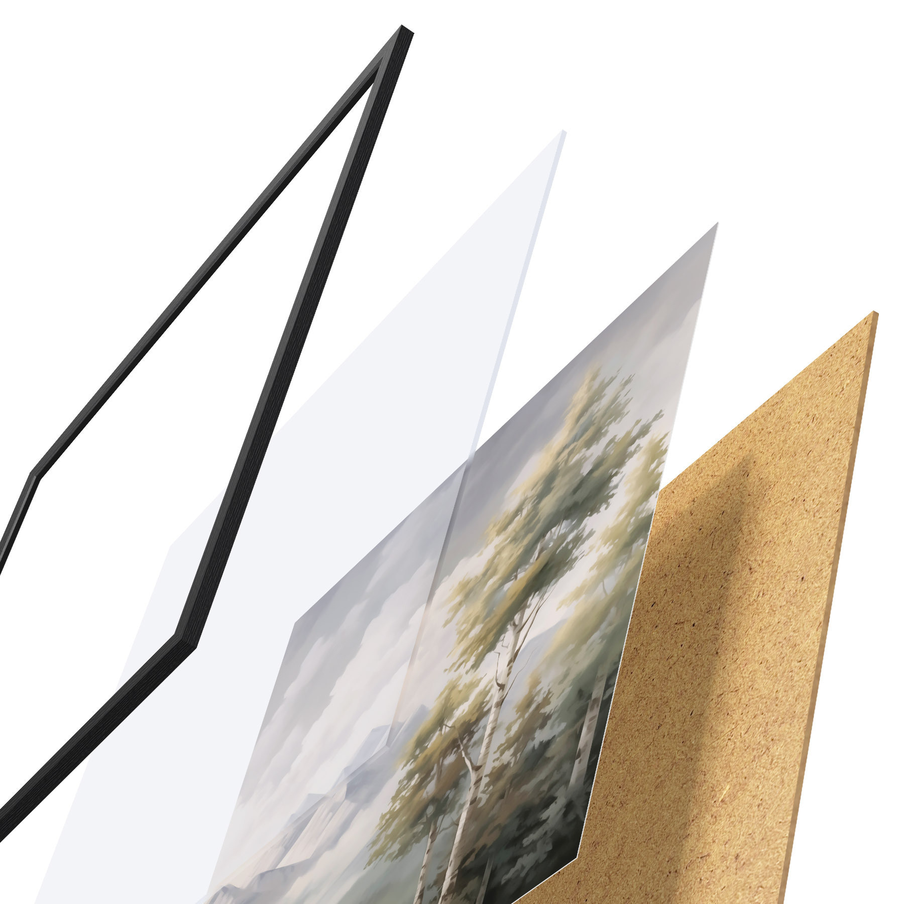Plakat składa się z ramy, pleksi, wydrukowanego obrazu i podkładu z płyty wiórowej. Plakat można natychmiast zawiesić na ścianie dzięki uchwytom z tyłu.