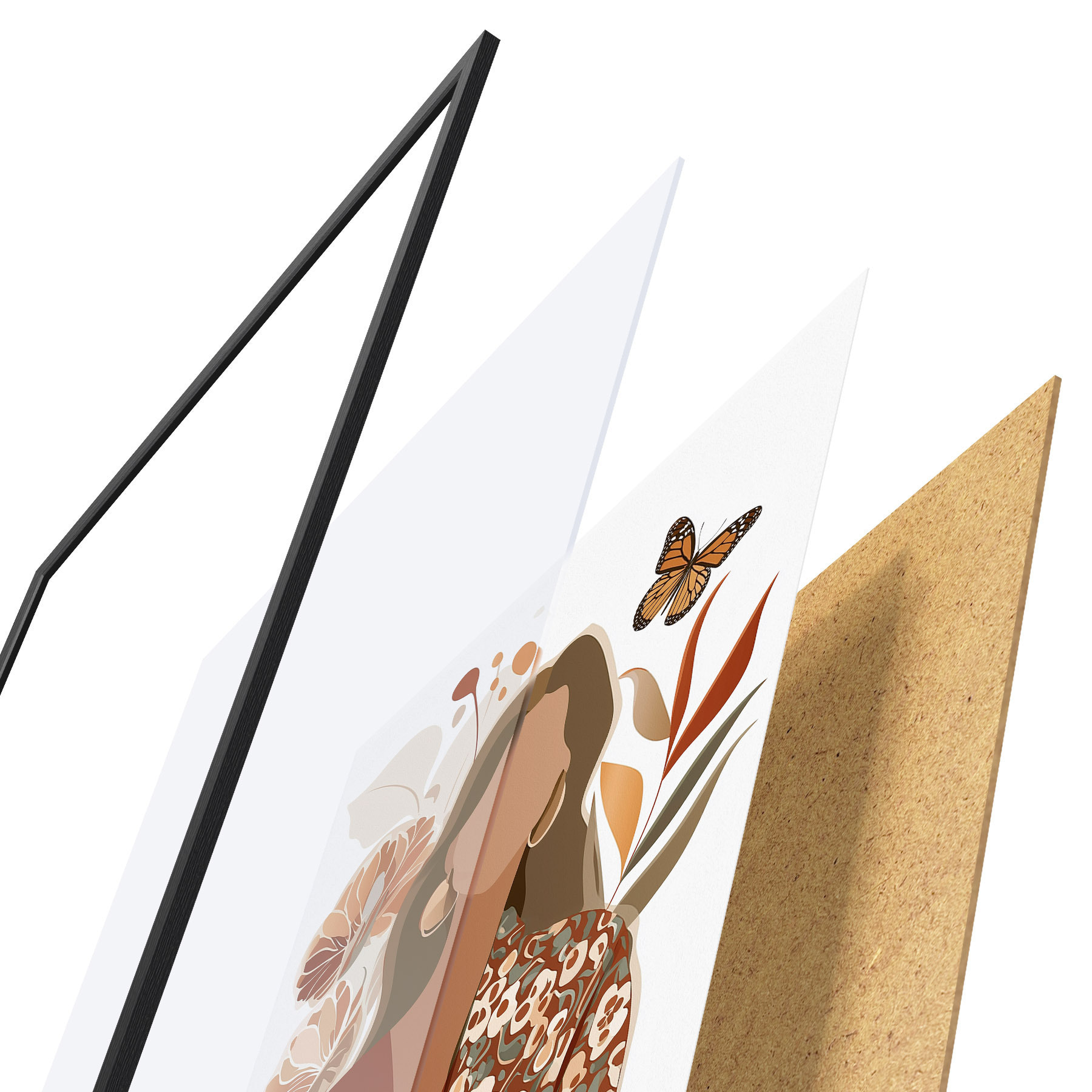 Plakat składa się z ramy, pleksi, wydrukowanego obrazu i podkładu z płyty wiórowej. Plakat można natychmiast zawiesić na ścianie dzięki uchwytom z tyłu.
