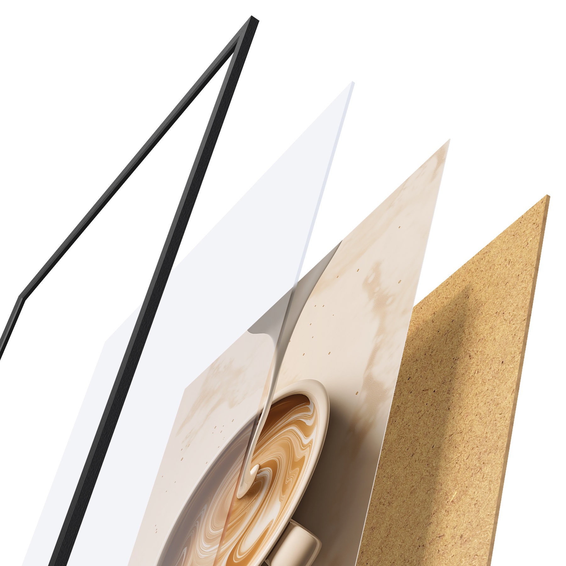 Plakat składa się z ramy, pleksi, wydrukowanego obrazu i podkładu z płyty wiórowej. Plakat można natychmiast zawiesić na ścianie dzięki uchwytom z tyłu.