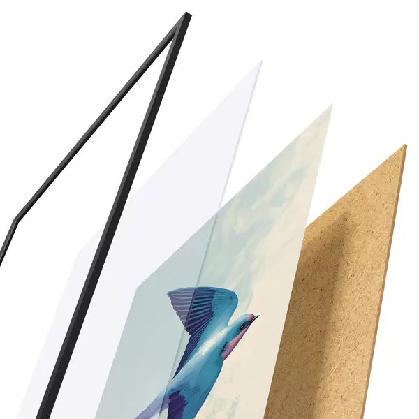 Plakat składa się z ramy, pleksi, wydrukowanego obrazu i podkładu z płyty wiórowej. Plakat można natychmiast zawiesić na ścianie dzięki uchwytom z tyłu.