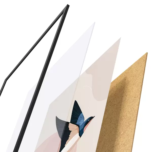 Plakat składa się z ramy, pleksi, wydrukowanego obrazu i podkładu z płyty wiórowej. Plakat można natychmiast zawiesić na ścianie dzięki uchwytom z tyłu.