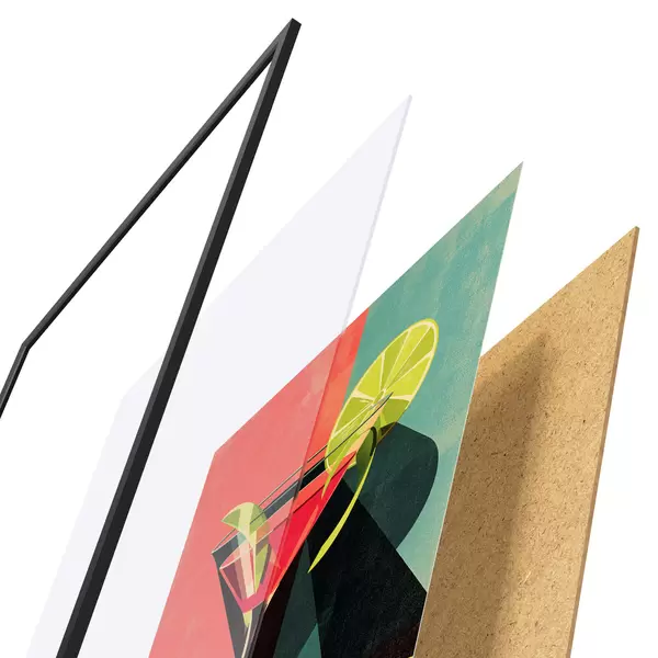 Plakat składa się z ramy, pleksi, wydrukowanego obrazu i podkładu z płyty wiórowej. Plakat można natychmiast zawiesić na ścianie dzięki uchwytom z tyłu.