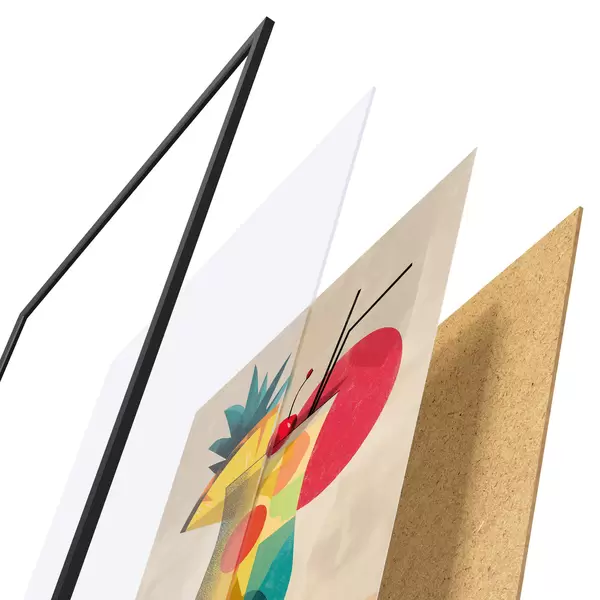 Plakat składa się z ramy, pleksi, wydrukowanego obrazu i podkładu z płyty wiórowej. Plakat można natychmiast zawiesić na ścianie dzięki uchwytom z tyłu.