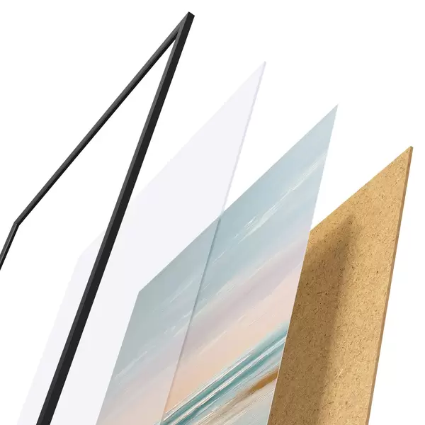Plakat składa się z ramy, pleksi, wydrukowanego obrazu i podkładu z płyty wiórowej. Plakat można natychmiast zawiesić na ścianie dzięki uchwytom z tyłu.