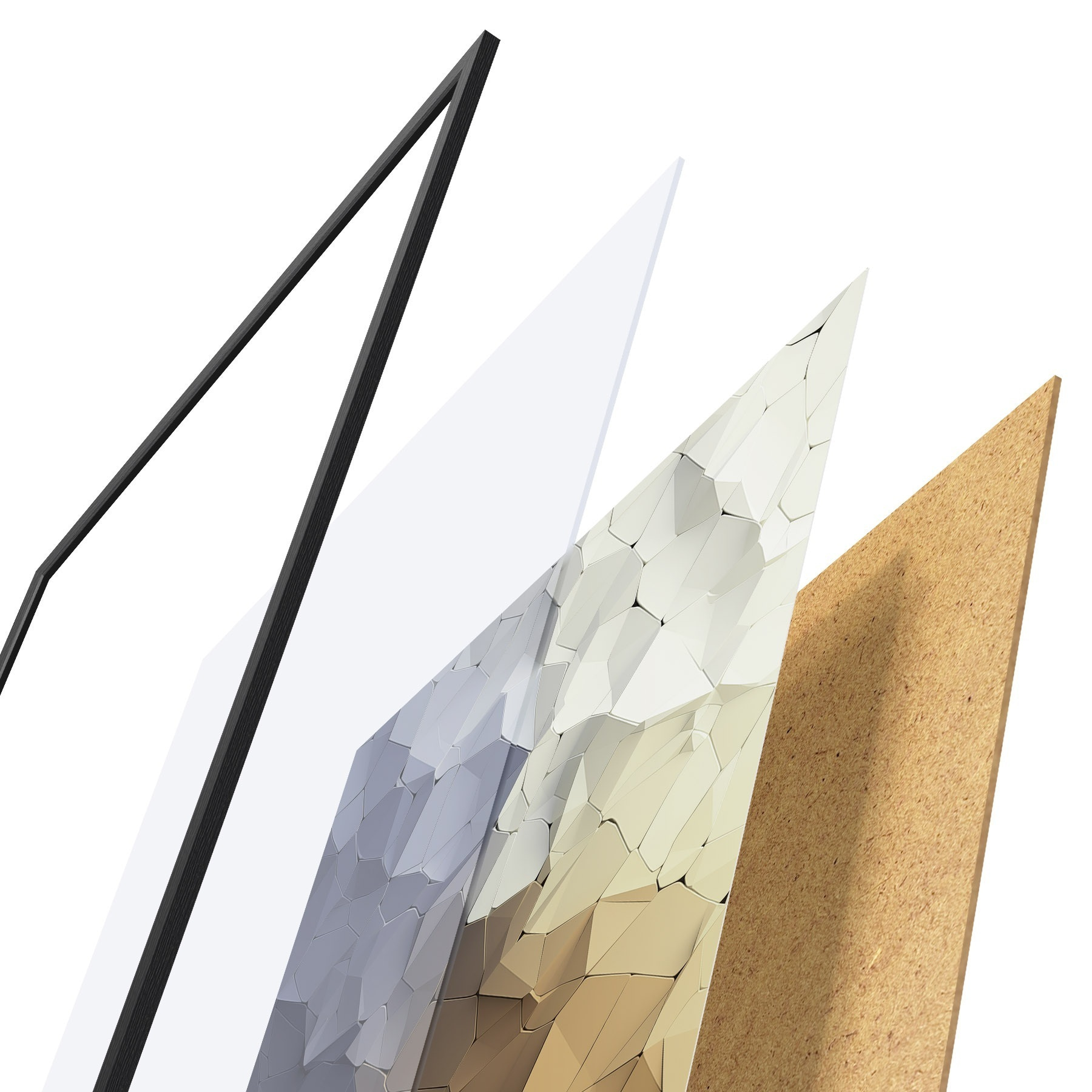 Plakat składa się z ramy, pleksi, wydrukowanego obrazu i podkładu z płyty wiórowej. Plakat można natychmiast zawiesić na ścianie dzięki uchwytom z tyłu.