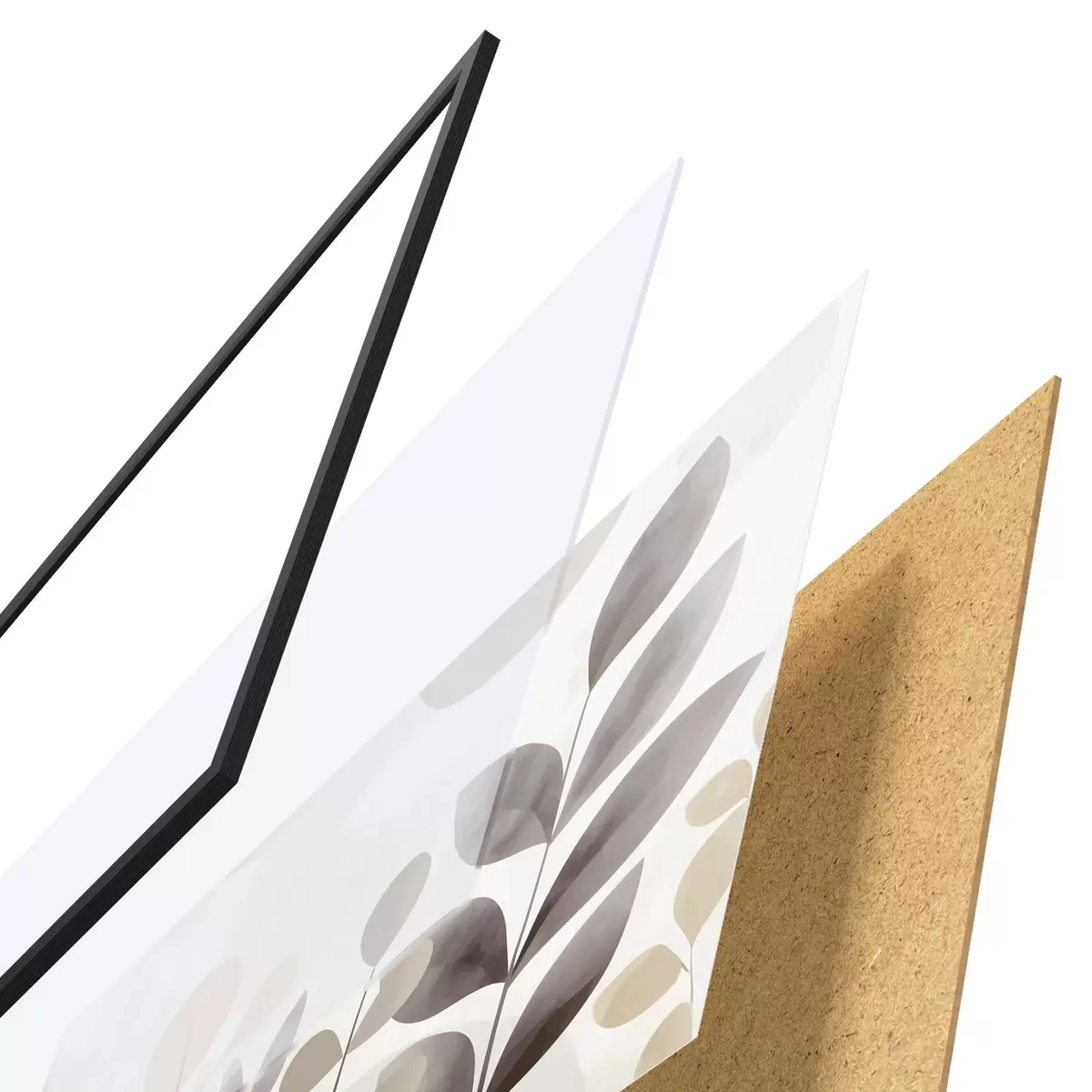Plakat składa się z ramy, pleksi, wydrukowanego obrazu i podkładu z płyty wiórowej. Plakat można natychmiast zawiesić na ścianie dzięki uchwytom z tyłu.