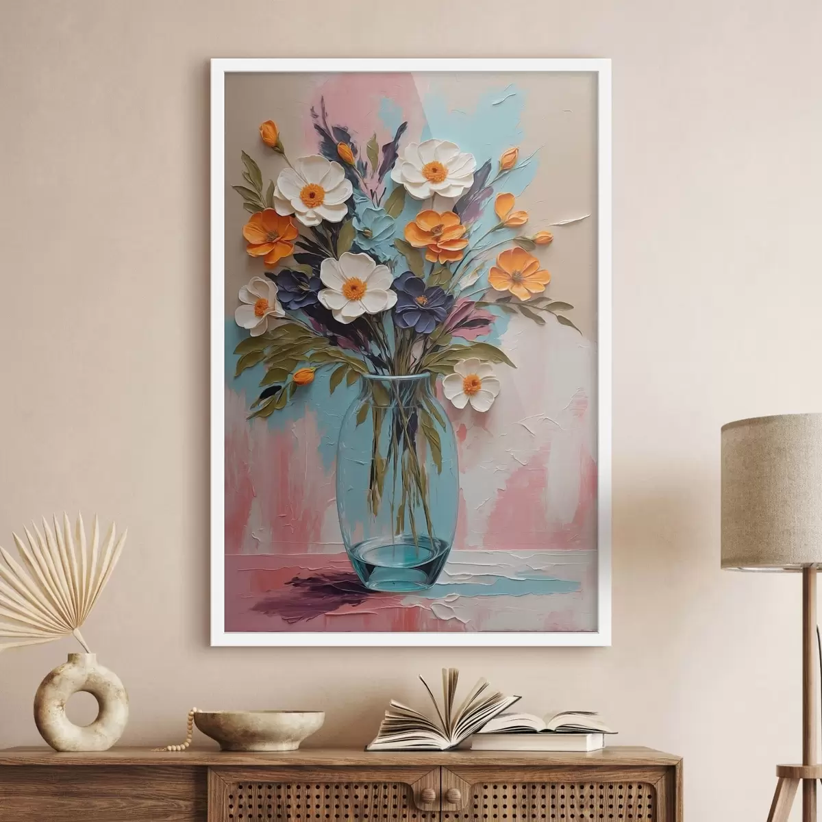 Poster Bukiet kwiatów w szklanym wazonie na kolorowym tle Nr f48488