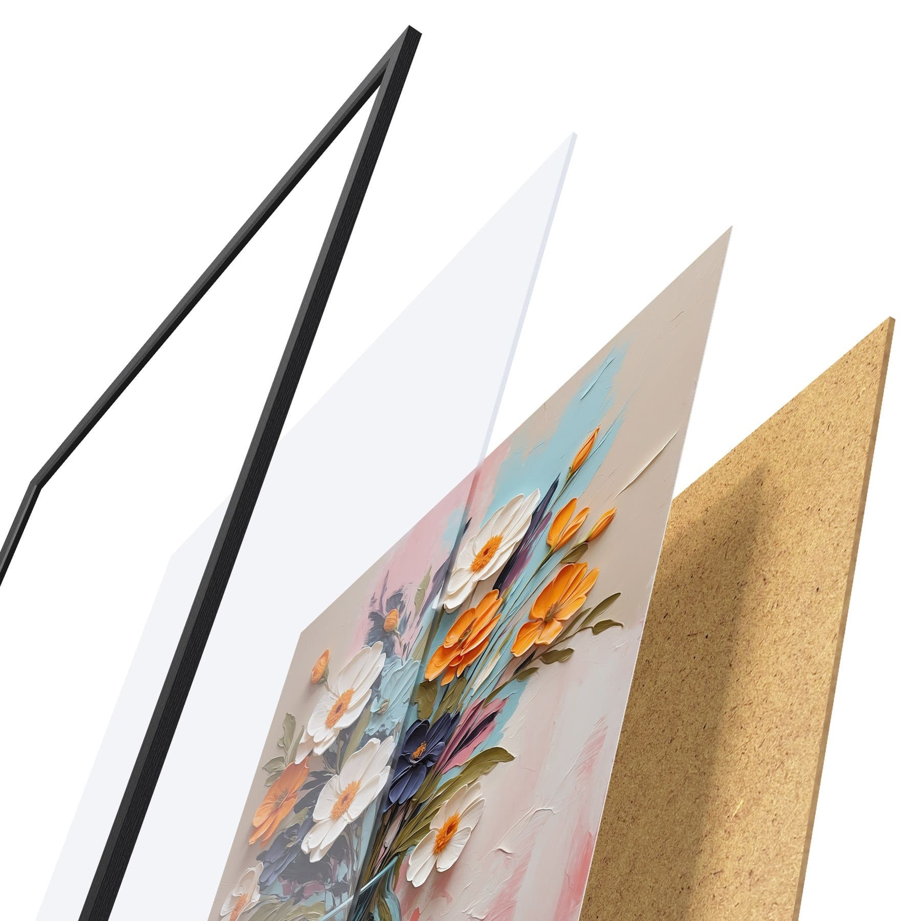 Plakat składa się z ramy, pleksi, wydrukowanego obrazu i podkładu z płyty wiórowej. Plakat można natychmiast zawiesić na ścianie dzięki uchwytom z tyłu.
