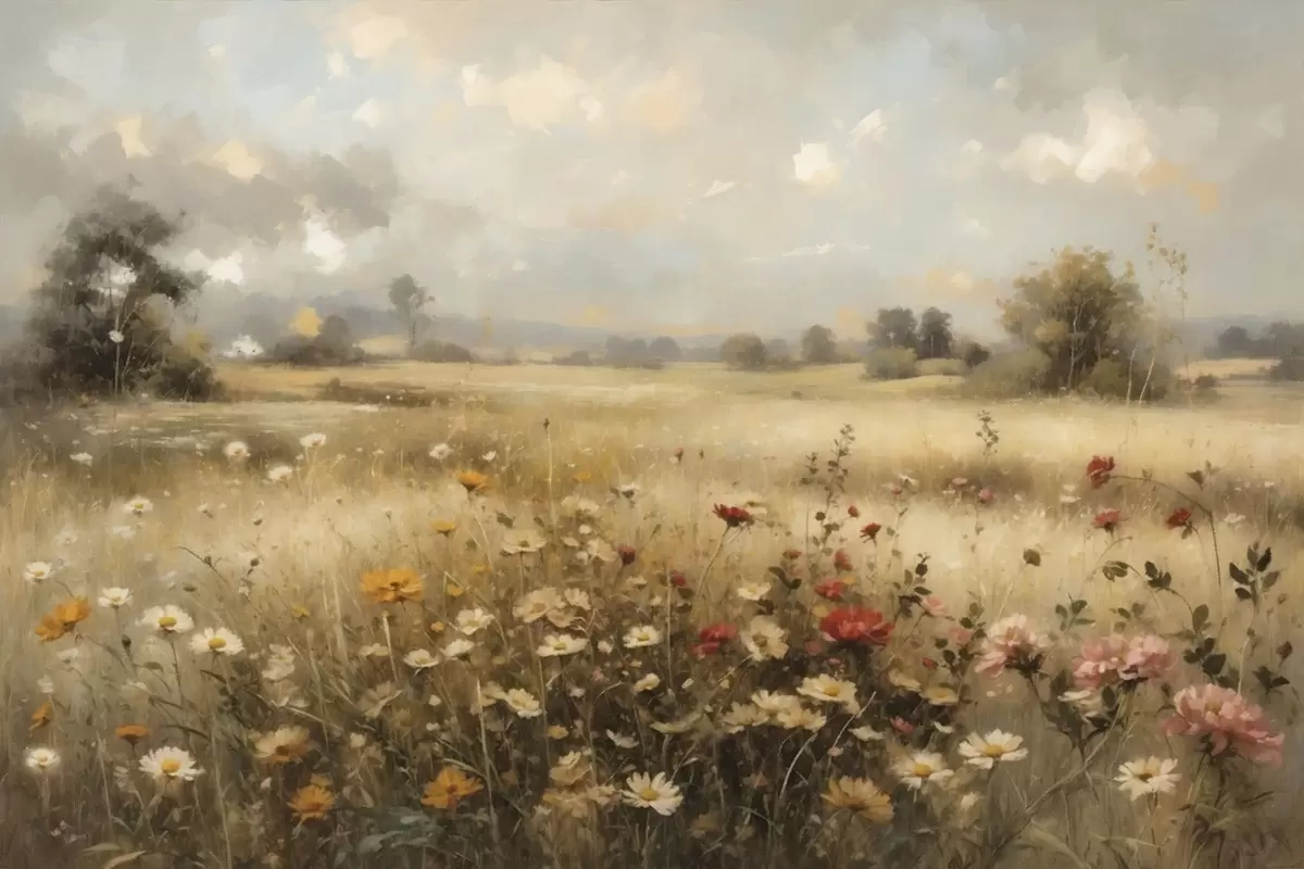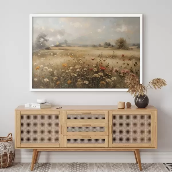 Plakat Pole pełne polnych kwiatów w delikatnym świetle f48491
