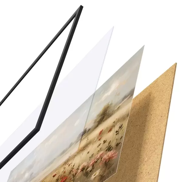 Plakat składa się z ramy, pleksi, wydrukowanego obrazu i podkładu z płyty wiórowej. Plakat można natychmiast zawiesić na ścianie dzięki uchwytom z tyłu.