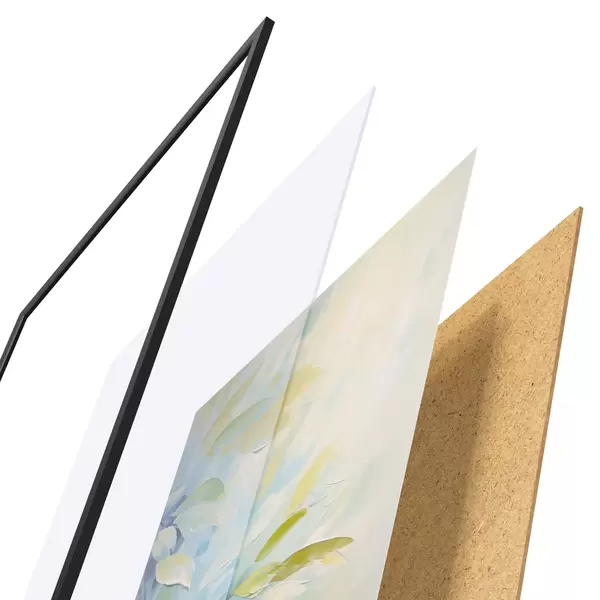 Plakat składa się z ramy, pleksi, wydrukowanego obrazu i podkładu z płyty wiórowej. Plakat można natychmiast zawiesić na ścianie dzięki uchwytom z tyłu.