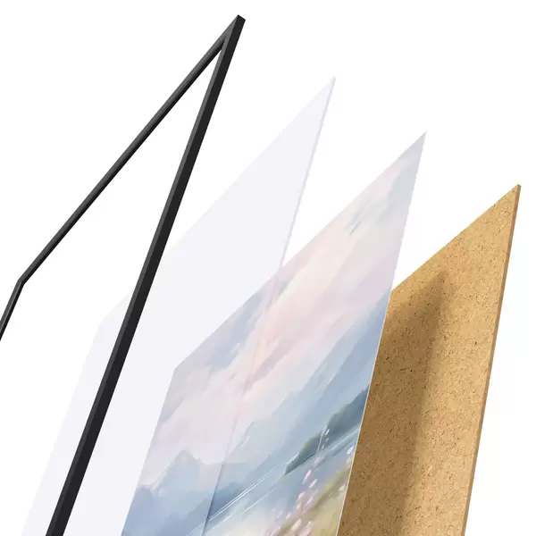 Plakat składa się z ramy, pleksi, wydrukowanego obrazu i podkładu z płyty wiórowej. Plakat można natychmiast zawiesić na ścianie dzięki uchwytom z tyłu.