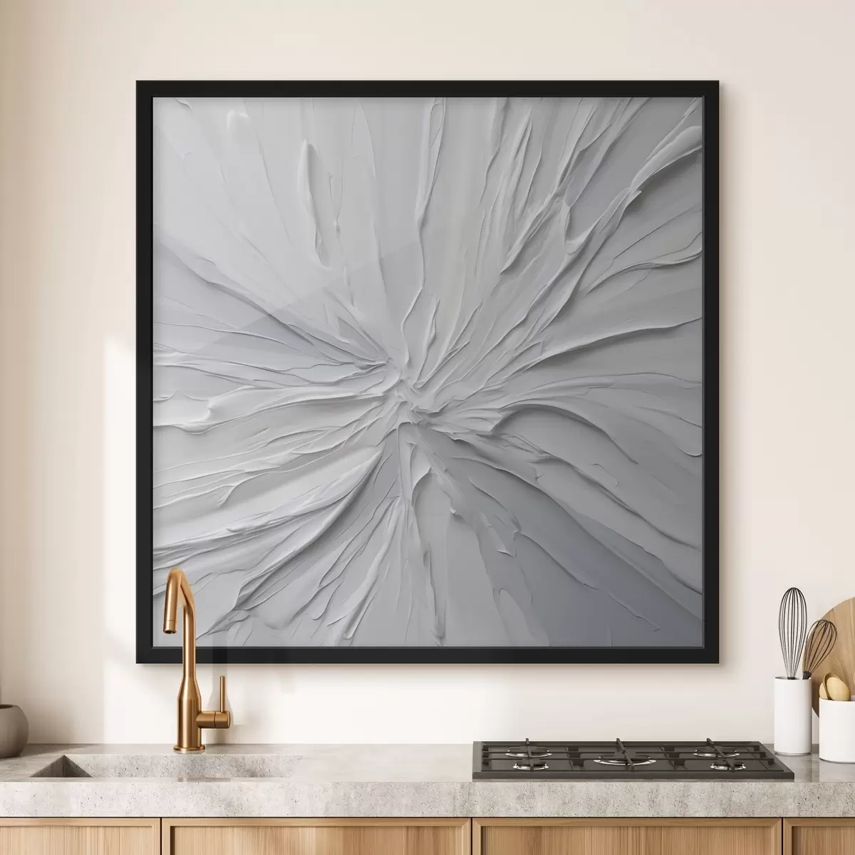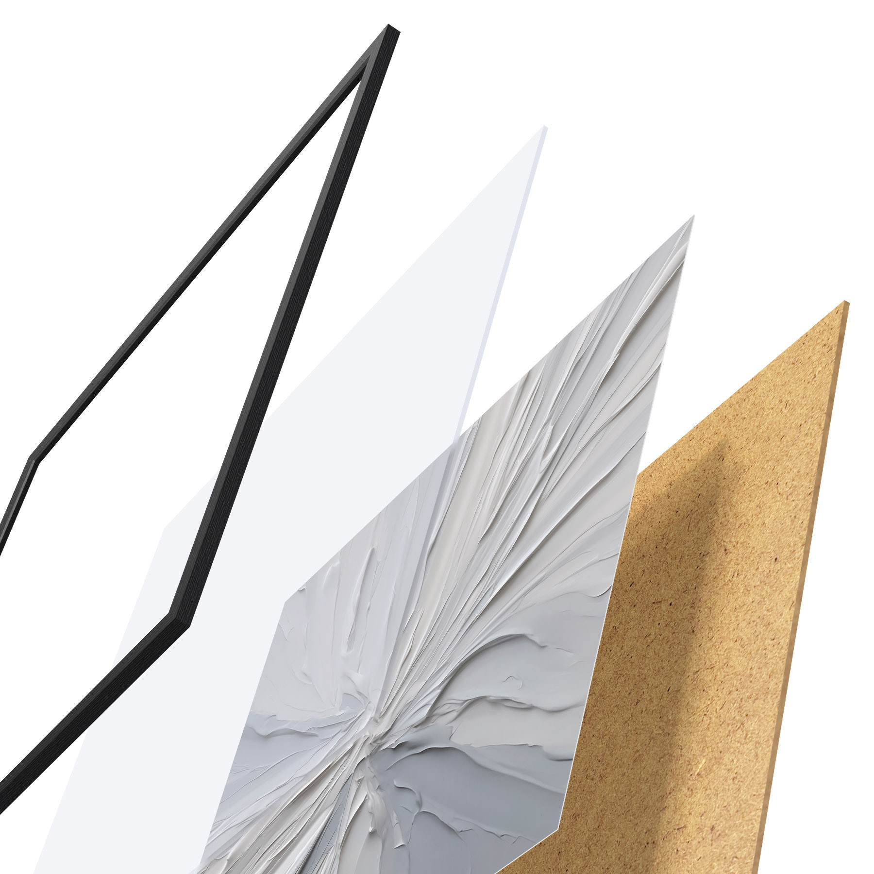 Plakat składa się z ramy, pleksi, wydrukowanego obrazu i podkładu z płyty wiórowej. Plakat można natychmiast zawiesić na ścianie dzięki uchwytom z tyłu.