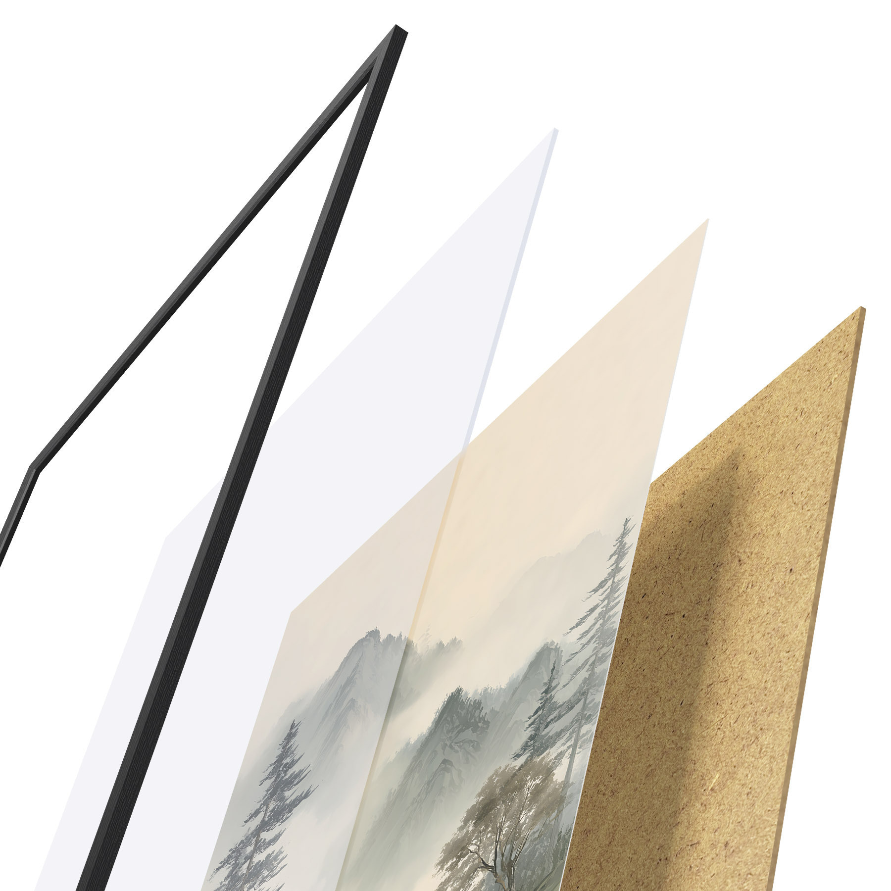 Plakat składa się z ramy, pleksi, wydrukowanego obrazu i podkładu z płyty wiórowej. Plakat można natychmiast zawiesić na ścianie dzięki uchwytom z tyłu.