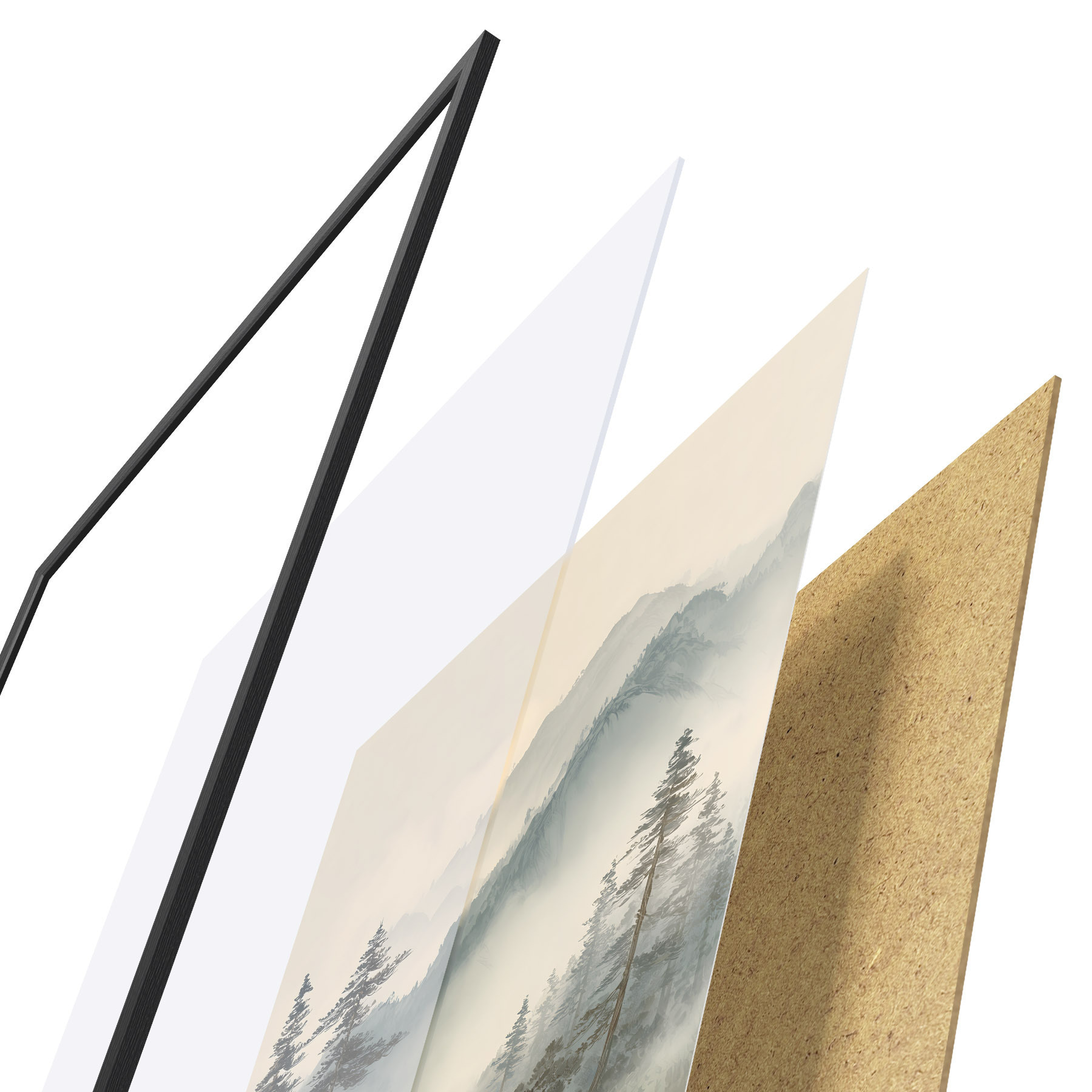 Plakat składa się z ramy, pleksi, wydrukowanego obrazu i podkładu z płyty wiórowej. Plakat można natychmiast zawiesić na ścianie dzięki uchwytom z tyłu.